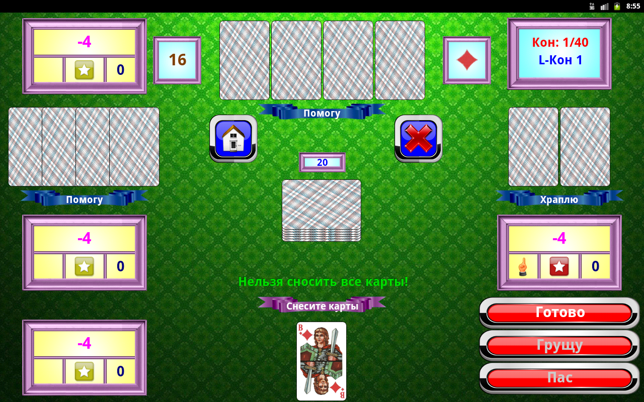 Азартная карточная игра "Храп", популярная в России. В программе реализован практически полный набор правил: здесь можно "Храпеть", "Веселить", "Помогать", "Грустить" и объявлять "Обяз". Однако нельзя "Идти в 5 карт": если все игроки отказались помогать, Банк забирает Храпун. Кроме того, пока в программе реализован только режим закрытого козыря: козырь объявляет Храпун или Весельчак. Сыграв 300 конов при хорошем счёте игрок попадает как в локальную таблицу чемпионов, так и в мировую. Можно выбрать одну из трех любимых советских колод: Атласную, Майя или Славянскую. Требуется размер экрана 800x480 или лучший. Поддерживаемые языки: English + Русский.