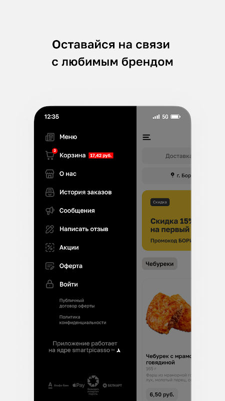 „Chebureks • Borisov“ ist eine Anwendung für die Lieferung von Lebensmitteln in Ihrer Stadt!