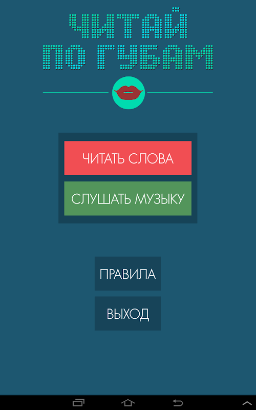 • №1 Spieler auf den Knopf drückt das Wort und seine Aufgabe zu lesen - zu löschen, die Artikulation mit, ohne Hinweise und Gesten sprechen ein Wort, das auf dem Bildschirm erscheint, und sobald der Spieler №2 erraten oder das Wort auf den Lippen, lesen Sie Zeit, um auf die grüne Taste zu klicken - rechts . Wenn ein Spieler nicht №2 erraten kann №1 Spieler drücken Sie die Taste WEITER, die das Wort ersetzen würde.