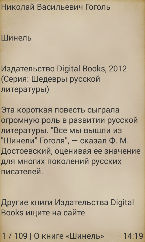 Der Verlag Digital Books beschäftigt sich mit der Popularisierung klassischer Literatur und der Unterstützung angehender Autoren. Wir veröffentlichen Bücher in Form von Anwendungen für mobile Geräte, die auf dem Android-Betriebssystem basieren. Über ein einfaches Menü kann jeder Leser die Darstellung des Buches individuell an die Eigenschaften seines Geräts anpassen.