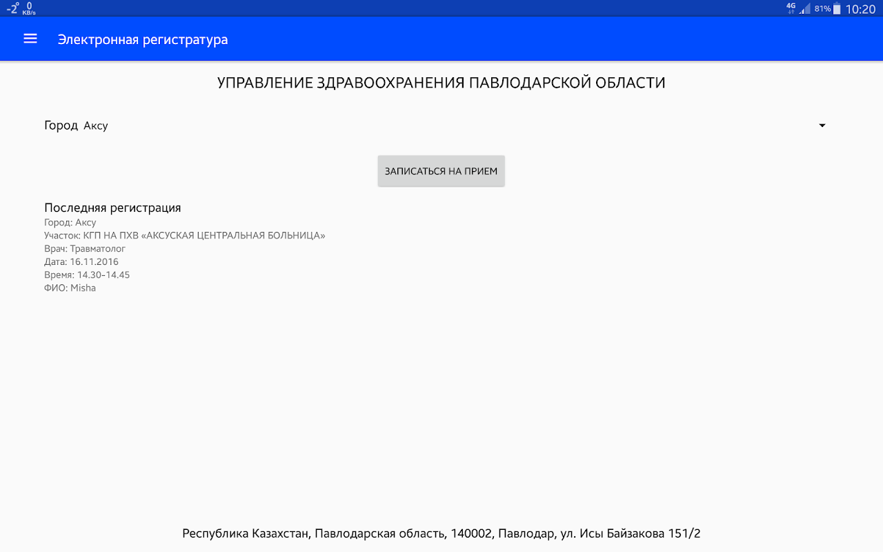 Онлайн регистратура для Аксуской центральной больницы (Республика Казахстан, Павлодарская область).