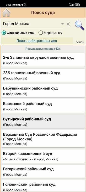- Wenn die Website des Gerichts oder die Website www.sudrf.ru derzeit nicht verfügbar ist, kann dies dazu führen, dass der Antrag seine Funktionen im Zusammenhang mit der Verarbeitung der aus diesen Ressourcen erhaltenen Informationen nicht erfüllen kann. Der Autor der Anwendung ist nicht verantwortlich für die Verfügbarkeit dieser Ressourcen.