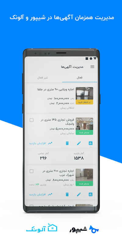 با امکانات اپلیکیشن دستیار هوشمند ویژه مشاوران املاک آلونک، مشاوران میتوانند با یک ابزار واحد به مدیریت فایلها و آگهیهای خود در دو بستر پرمخاطب شیپور و آلونک بپردازند.