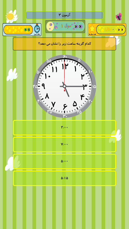 هدف از طراحی این برنامه آموزش کامل ساعت به کودکان است. علاوه بر آموزش در این برنامه 5 مرحله آزمون متنوع گذاشته شده است هر مرحله 36 سوال تصویری دارد.تمام سوالات آزمون ها را بنده طراحی کردم.پاسخ درست به هر سوال باعث کسب یک ستاره می شود یعنی باید در هرآزمون 36 ستاره کسب کنید تا مدال طلا در آن آزمون را بدست آورید و در صورت پاسخ به همه آزمون ها و کسب 180ستاره به جام طلایی دست خواهید یافت.