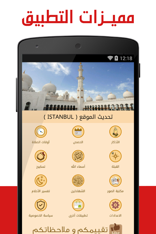 • التنبيه لاوقات الصلاة سواء باختيار اذان كامل او فقط بختيار اشعار ينبهك بوقت الصلاة