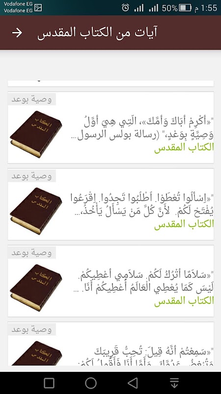 يرسل تطبيق آيه من الكتاب المقدس (Arabic Bible ) كل يوم نتبيه لك علي هاتفك يحتوي علي آيه من الكتاب المقدس (الانجيل) باللغة العربية يمكنك ان تقراءها وتحفظها بدون الحاجة الي الانترنت