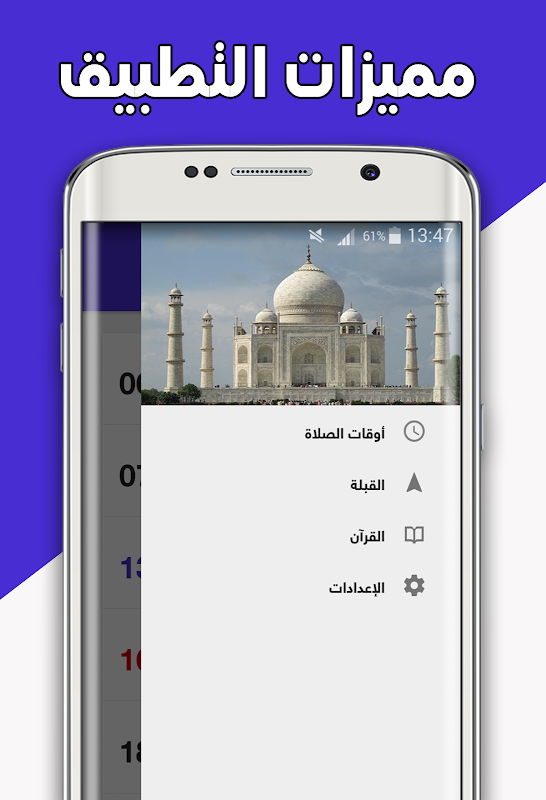 - يقوم التطبيق بعرض أوقات صلاة الفجر، الشروق ، الظهر، العصر، المغرب ، العشاء