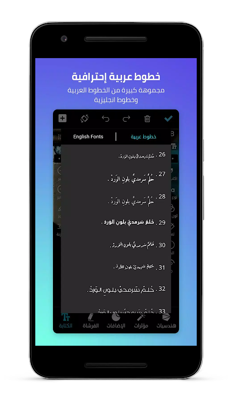 ستجد في تطبيق Arabic designer كل الأدوات التي تحتاجها من أجل إضافة النصوص إلى كل صورة من الصور بطريقة سهلة للغاية. ستكون هنا قادرا على تعديل اللون ونوع الخط من أجل جعل كل صورة من الصور التي تلتقطها على هاتفك مثيرة ومتميزة.