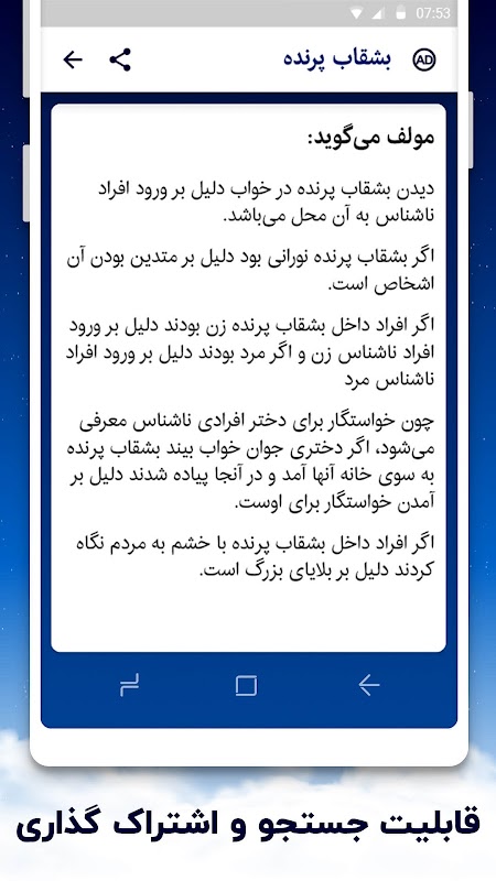 • امکان اشتراکگذاری تعبیر خواب در شبکههای اجتماعی و ارسال به دوستان