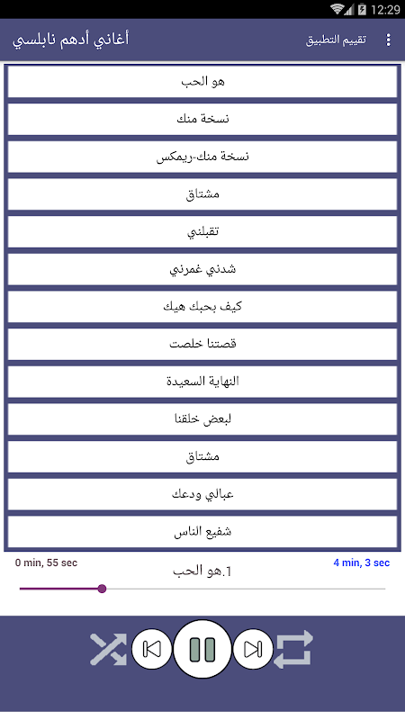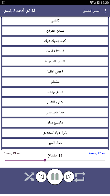 يحتوي التطبيق على الاغاني التالية: