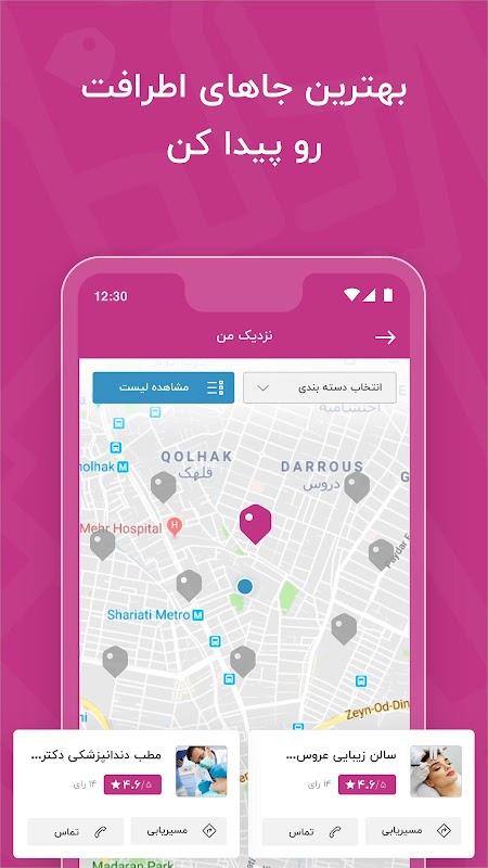 ✔️ همهی مکانها رو روی نقشه ببینید و نزدیکترین اونها رو انتخاب کنید.