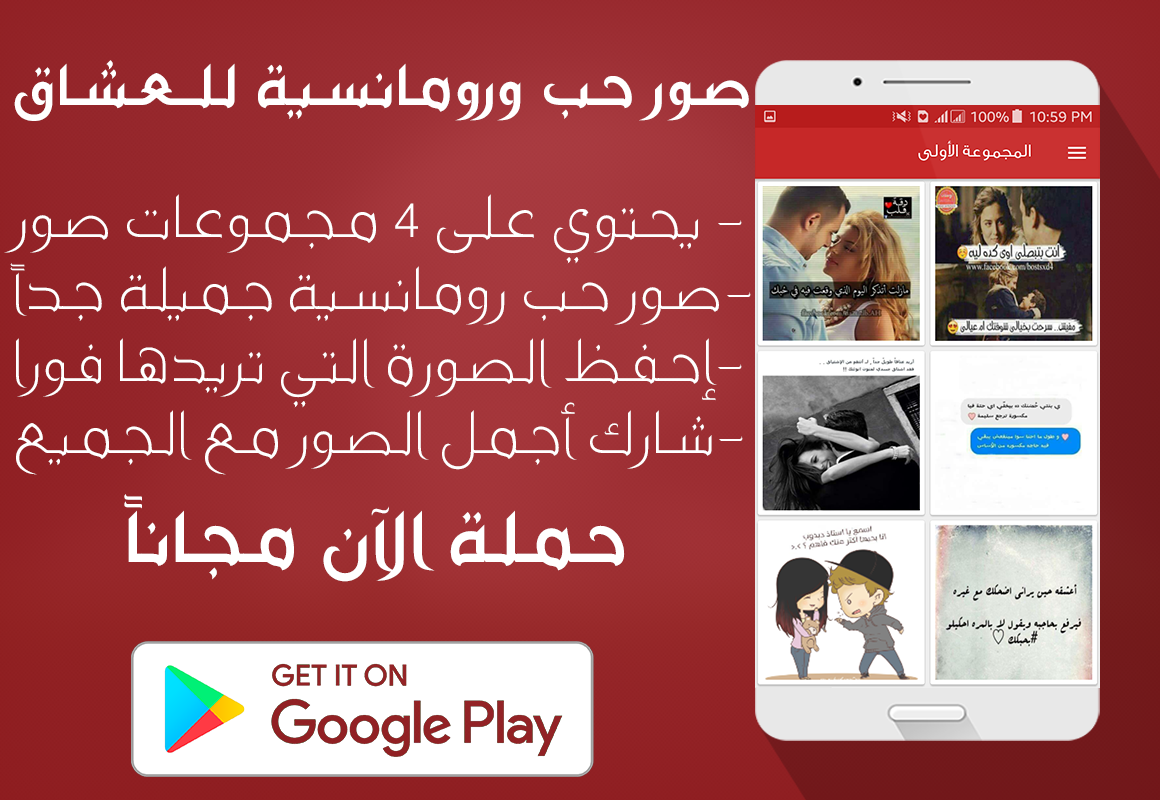 يتضمن هذا التطبيق على أروع صور الحب و الغرام و الرومانسية و رسائل حب مكتوب عليها عبارات حب و أشعار حزينة ,كذلك يمكنك مشاركتها مع حبيبك أو حبيبتك كحالات وات ساب و حالات فايسبوك أو وضعها كصور للفيس بوك، هذا التطبيق به مجموعة كبيرة من خواطر حب رومانسية و خواطر حزينة معبرة للحبيب أو الحبيب و كذا صور شعرية رومانسية و صور عتاب حزينة و رسائل حب رومانسية ، كما ستجد(ين) فيه صور عشق عليها كلمات رومانسية و و أخرى مكتوب عليها كلمات وعبارات عن الغرام و الفراق