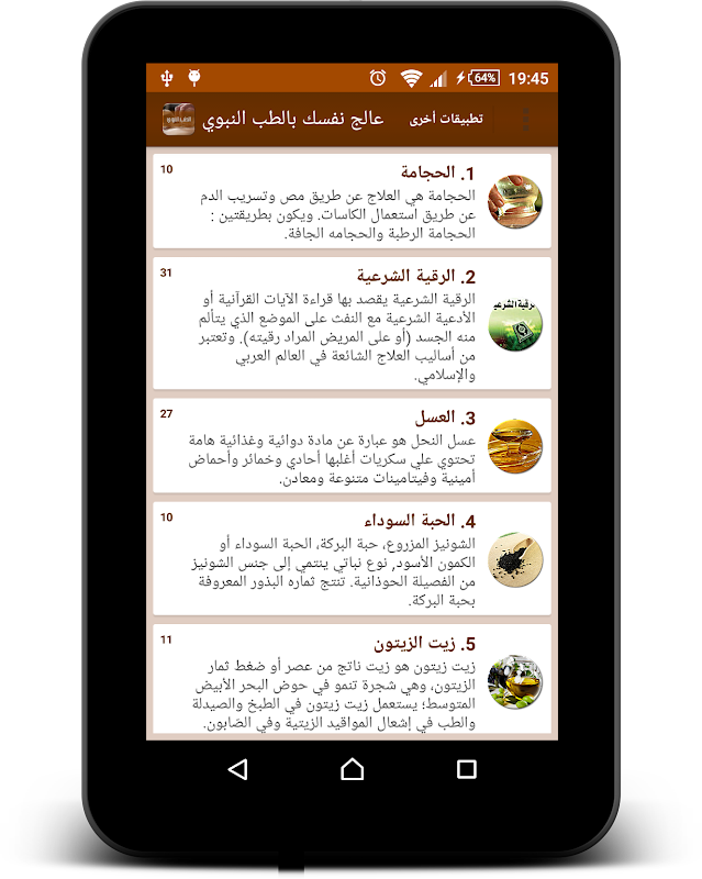 الرقية الشرعية والحجامة والعسل والتلبينة وزيت الزيتون والكمأة و القسط والكفر والسواك والحبة السوداء كلها تصنيفات تجدها في تطبيق الطب النبوي العربي مع طرق وقاية وعلاج مختلفة بداخلها.