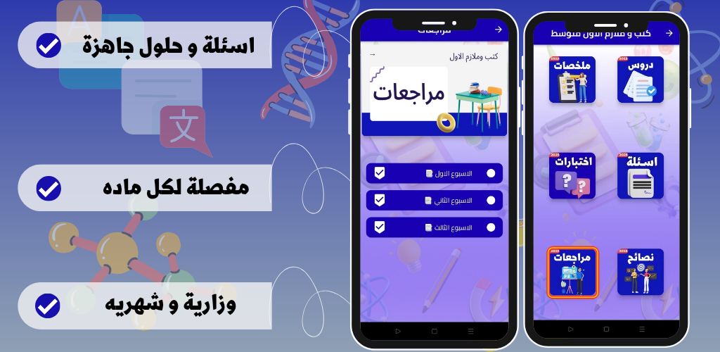 1. **Eine umfassende Bibliothek mit Lehrbüchern**: Die Anwendung enthält elektronische Kopien aller für die erste Mittelstufe erforderlichen Lehrbücher, was den Schülern den Zugriff auf die Bildungsinhalte jederzeit und von überall aus erleichtert Arabisches Buch, die erste Mittelstufe und das erste islamische Buch der Mittelstufe. Das erste Mathematikbuch ist die Mittelstufe, das erste Englischbuch ist die Mittelstufe, das erste Biologiebuch ist die Mittelstufe 2025, das erste Physikbuch ist die Mittelstufe 2025, das erste Chemiebuch ist die Mittelstufe 2025, und das erste sozialwissenschaftliche Buch ist Mittelstufe 2025.