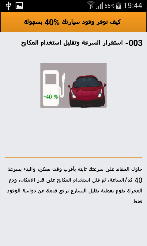 تطبيق كيف توفر وقود سيارتك %40 بسهولة مجموعة من النصائح الذكية لتوفير استهلاك الوقود في سيارتك بمعدل قد يصل إلى 40%.