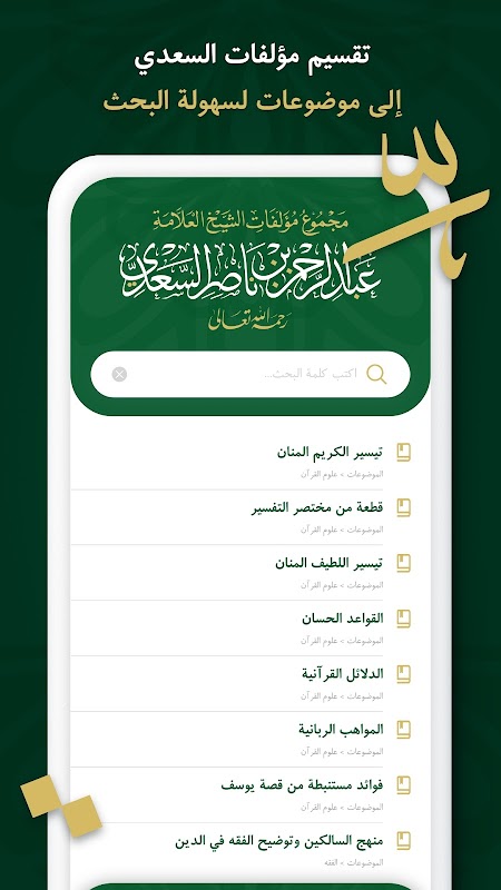 تطبيق مؤلفات السعدي .. مجموعة مؤلفات الشيخ العلامة عبد الرحمن بن ناصر السعدي - رحمه الله - يتضمن مجموع مؤلفات الشيخ السعدي في موضوعات علوم القرآن الكريم, وأشهرها تفسيره «تيسير الكريم الرحمن في تفسير كلام المنان» والمشهور ب «تفسير السعدي», كما يضم التطبيق مؤلفات الشيخ السعدي في الحديث الشريف, والفقه, والعقائد, والآداب الشرعية, والأخلاق في الإسلام, والفتاوى الشرعية, وما قدمه الشيخ في حياته; من دروس في الفقه المقارن, ومراسلات, ومقالات, بالإضافة إلى الخطب والمؤلفات في الفقه وأصوله.