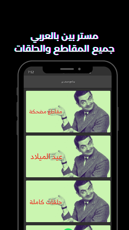 Eine Anwendung, um alle Episoden und Clips der Mr. Bean-Serie auf Arabisch an einem Ort anzusehen und zu genießen.