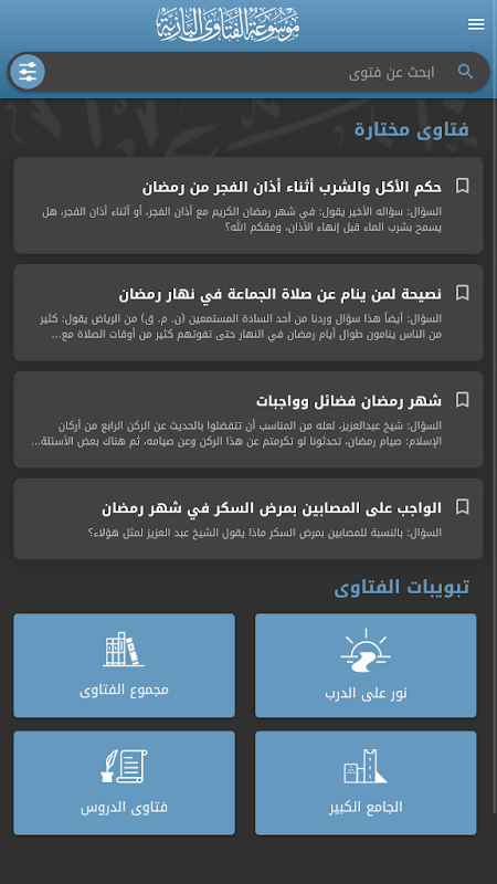 In dieser Anwendung wurde ein Strahl des Erbes dieses ehrwürdigen Imams, dargestellt in seinen Fatwas und Antworten auf die Fragen der Menschen, die gesammelt und gepflegt wurden, zu einem großartigen Buch des Wissens und zu einem Leitfaden, der die Menschen von dem wegführt, was sie verwirrte die Angelegenheiten ihrer Religion.