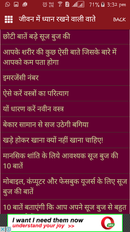 This application provide you lot of great things which help you in your life. This application provide you tips for hot to solve difficulties of your life. This application is a free of cost . This application contain gyan ki bate, suvichar in hindi, motivational quotes and things which help you to solve problems of your life. We have compiled a list of the top life lessons as a person you must know.