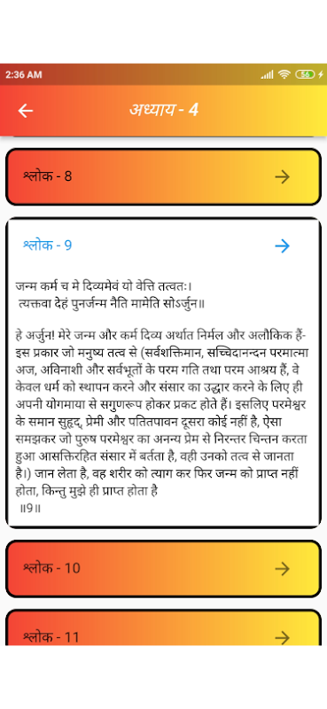 Beginnen Sie mit der Nutzung dieser erstaunlichen App mit einer schönen und benutzerfreundlichen Oberfläche, die vollständige Übersetzungen des Bhagwat Geeta in Hindi enthält. Ihre Suche endet hier mit dieser App.
