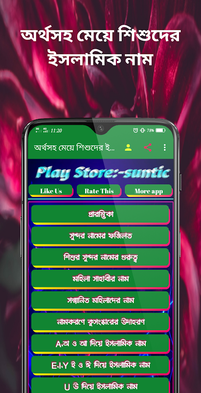 ইসলামী নাম রাখার আগ্রহ থাকার পরও অজ্ঞতাবশত আমরা এমনসব নাম নির্বাচন করে ফেলি যেগুলো আদৌ ইসলামী নামের আওতাভুক্ত নয় বা. পিতা-মাতা ও পরিবার ঐ নামেই ডাকে ডাকে নাম তারা শিশুর শিশুর জন্য নির্বাচন করে। মুসলিম শিশুদের ইসলামিক নাম ও অর্থ সহ নামের বই থেকে আপনার শিশুর শিশুর জন্য নাম রাখতে রাখতে। মুসলমানেরা শিশুদের নাম রাখার সময় চায় তার মেয়ে অথবা ছেলে শিশুটির নাম যেন ইসলামিক নাম হয় তাই আমরা অ্যাপটিতে মেয়েদের ইসলামিক নাম ও. তাই আমাদের অ্যাপটি ডাউনলোড করে আপনার শিশুদের সুন্দর নাম খু্ঁজে বের করুন ।নেক সময় মেয়ে শিশুদের নামের অর্থ না জেনে রাখায় অনেক বিরম্বনার সৃষ্টি হয়। মেয়েদের ইসলামি নাম ও অর্থ বলতে বুঝায় আরবী নাম ও শব্দার্থ।নামের তালিকা ডাউনলোড করে নিন মেয়ে শিশুদের নাম খুঁজতে আপনাকে আমাদের এই অ্যাপটি সাহায্য