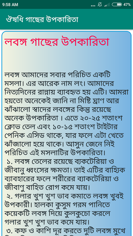 এই এপসটিতে রয়েছে রোগ নিরাময় করুন ঔষধি গাছ দিয়ে, ঔসাধি (ভেষজ) গাছ পরিচিতি বিভিন্ন রোগে ঔষধি গাছের উপকারিতা ভেষজ