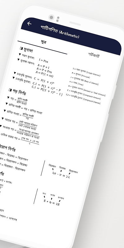 ৩. পাটিগণিত, বীজগাণিতিক, জ্যামিতি, পরিসংখ্যান ও ত্রিকোণমিতির সকল সূত্র তুলে ধরা হয়েছে।