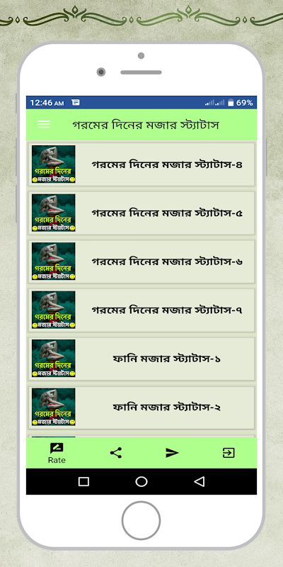গরমের দিনের মজার স্ট্যাটাস এই অ্যাপসটি থেকে আপনারা দিনের এবং রাতের মজার স্ট্যাটাস স্ট্যাটাস পাবেন। গরমের দিনের রোমান্টিক এস এম এস স্ট্যাটাস পাবেন।আরো পাবেন বৃষ্টির দিনের ফানি রোমান্টিক কবিতা ছন্দ স্ট্যাটাস পাবেন। গরমের দিনের গরম রাতের স্ট্যাটাস - Lustiger Status পাবেন। যা আপনারা অনলাইনে শেয়ার করে নিজে মজা পাবেন অন্যকে মজা দিতে দিতে।
