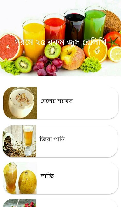 গনগনে গরমে কনকনে ঠান্ডা শরবতের মজাই আলাদা। গরমে এক গ্লাস ঠাণ্ডা পানি যদি শরীর জুড়িয়ে দিতে পারে তবে এক গ্লাস শরবত যে মন ভরিয়ে দেবে তা নিঃসন্দেহে বলা যায়। গরমে এখন প্রাণ জুড়িয়ে দিতে পারে ঠান্ডা এক গ্লাস শরবত। বাড়িতে সহজে বানিয়ে নিতে পারবেন এমন ২৫ টি শরবতের রেসিপি দিয়ে আমাদের এই এপস টি সাজান হয়েছে । আমাদের শরবত রেসিপি গুলা হলো -বেলের শরবত,