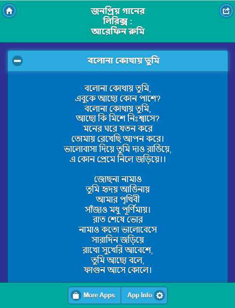 এ সময়ের জনপ্রিয় গায়ক আরেফিন রুমি। এই অ্যাপে থাকছে আরেফিন রুমির জনপ্রিয় কিছু গানের লিরিক্স।