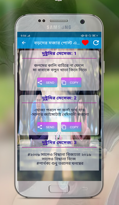 এই অ্যাপটিতে আপনাদের জন্য রয়েছে ছেলে VS মেয়ে দুষ্টুমির এস.এম.এস। সবগুলো এসএমএস সম্পন্ন বাছাইকৃত ভাবে নেওয়া হয়েছে ।আশা করি আপনাদের অনেক ভালো লাগবে।