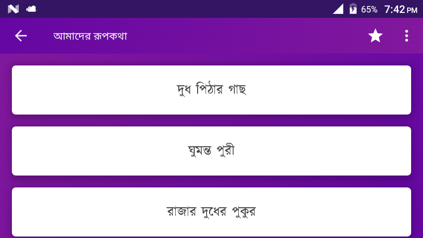 This app contains a lot of fairy tales stories in bangla. Fairy tales is known to all. Fairy tales stores book free for all. Students can learn a lot from this application which will develop their mind as well as teach them good mannar. It will give the children's lot of pleasure and joy. This app has a lot of nice stories, educational stories and joy stories.