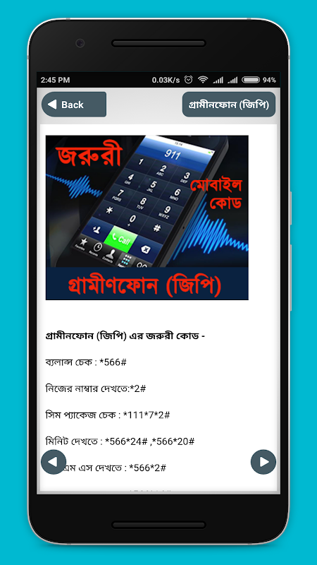 জরুরী মোবাইল কোড,সকল সিমের দরকারি কোড ও সকল সিমের সকল তথ্য সবারই জানা উচিত। মোবাইলে ব্যবহৃত সিম কোম্পানির সকল সিমের অফার, অনেক গোপনীয় জরুরী মোবাইল কোড ও বিভিন্ন সার্ভিসের শর্ট কোড সম্পর্কে জানলে সহজেই কাঙ্ক্ষিত প্যাকেজ ব্যবহার করা সম্ভব। মোবাইল ফোন ব্যবহারকারীদের জন্য মোবাইল টিপস, জরুরী মোবাইল নাম্বার, বর্তমান সময়ের সকল সিমের দরকারি কোড important code of mobile sim 2018, বিভিন্ন অপারেটরের সকল সিমের দরকারি সব তথ্য - All Sim USSD Code, কাজের সময় সকল সিমের দরকারি কোড-all sim code number-সিম কোড ও সকল সিমের দরকারি কোড ও বোনাস/ mobile offer রয়েছে যা জানা থাকা অনেক দরকারি। মোবাইল কোড সকল ফোনের অর্থাৎ মোবাইলের সব সিম ব্যবহারকারীদের জন্য সকল সিমের অফার ২০১৮/sim offer 2018 ও জরুরী মোবাইল কোড/সকল সিমের দরকারি কোড important code of mobile sim 2018 এবং কিছু মোবাইল টিপস Mobile tips Bangla নিয়েই আমাদের এই ফ্রি বাংলা এপস যা আশা করি আপনাদের ভাল লাগবে ও কাজে আসবে।