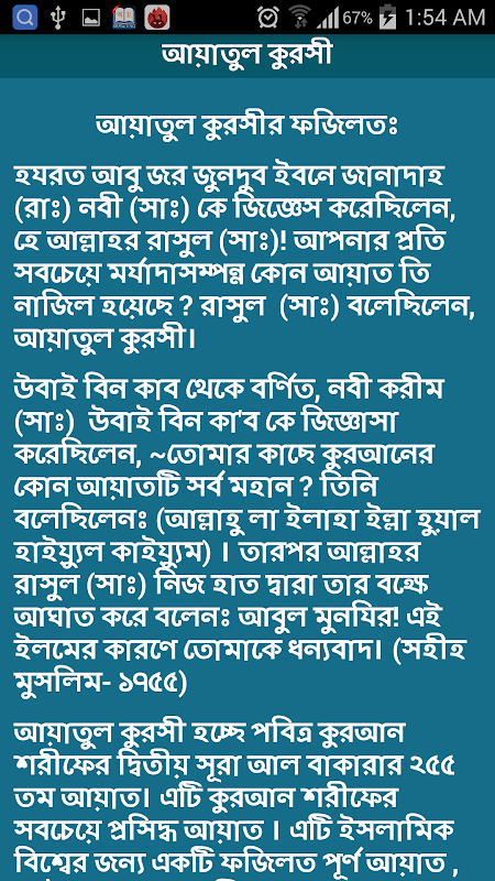 নবী করীম হযরত মুহাম্মাদ (সাঃ) বলেছেন, যে ব্যক্তি প্রত্যহ পাঁচ ওয়াক্ত নামজের পর সঙ্গে সঙ্গে আয়াতুল কুরছি পাঠ করবেন তার আর জান্নাতের মাঝে শুধু ব্যবধান থাকল মৃত্যু। অর্থাৎ মৃত্যু হলেই তিনি জান্নাতে যাবেন।"