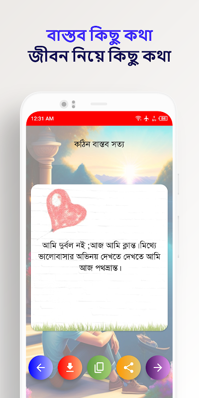 বাস্তব জীবন নি য়ে কিছু কথা নিয়ে আমাদের এই অ্ যাপসটি তৈরি করা হয়েছে। প্রতিদিন অনেক মানুষ বাস্তব জীবন নিয়ে কিছু কথ া পেতে চায়। তাই আমরা আজকে আমাদের এই অ্যাপসটিতে বাস্তব জীব ন নিয়ে কিছু কথা তুলে ধরেছি।