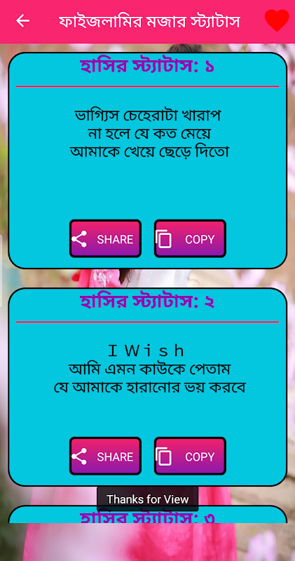 এই অ্যাপসটিতে যে সব হাসির জোকস স্ট্যাটাস আছে তা অপনি বন্দুদের সাথে ১ কিল্কে কপি এবং শেয়ার করতে পারবেন ।