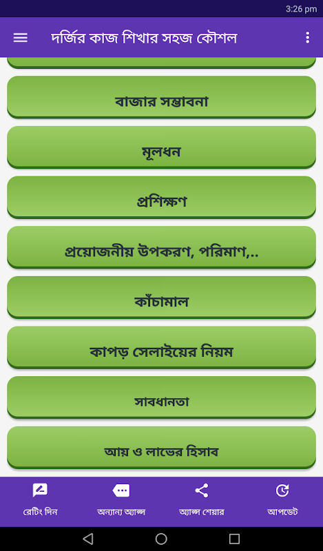 দর্জির কাজ শিখার সহজ কৌশল । কি ভাবে ঘরে বসে দর্জির কাজ করবেন তা অনেকে জানি না । যেমন , ক্রস সেলাই * জোড়া সেলাই বা সিমিং * রানিং সেলাই * মুড়ি সেলাই * বোতাম লাগানো * কম্বল ফোঁড় বা ব্লাংকেট স্টিচ * সাটিন ফোঁড় বা সাটিন ... মেয়েদের জ্যাকেট * সামনের অংশের মার্কিং * আস্তিন সম্পর্কে বিশেষ জ্ঞাতব্য * স্কয়ার-কাট সেমিজ * মেয়েদের আধুনিক জামা * সেলাই করার নিয়ম * প্রয়োজনীয় কাপড় ইত্যাদি নানা রকম কাজ । এই অ্যাপস থেকে দর্জির কাজ শিখতে পারবেন ।