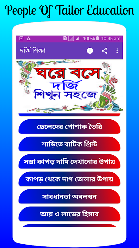 আমাদের এই অ্যাপ থেকে সহজে আপনি দর্জি শিক্ষা সম্পর্কে জানতে পারবেন।এবং ঘরে বসেই আমাদের অ্যাপ থেকে দর্জি কাজ শিখে জিবিকা নির্বাহ করতে পারবেন।