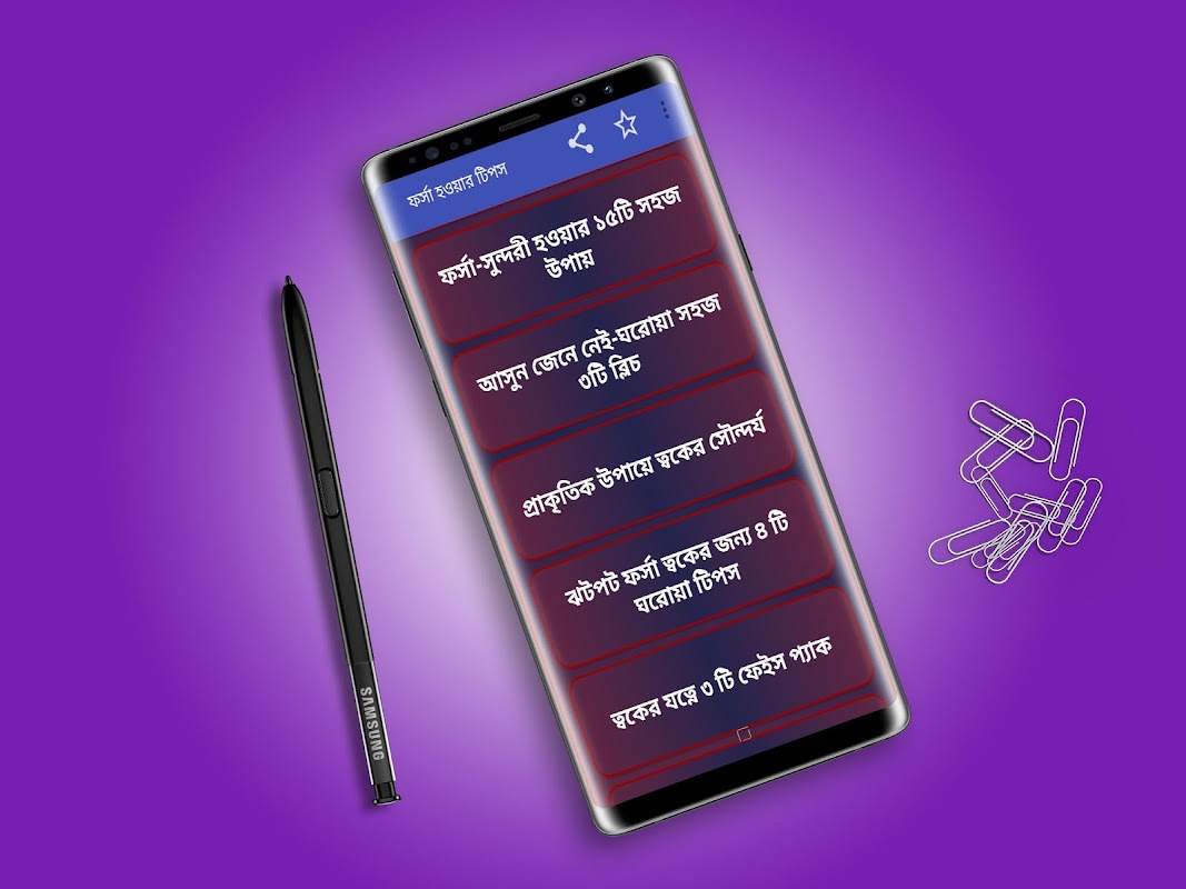 ফর্সা হওয়ার উপায় Forsha Howar Upay একটি বিউটি টিপস বা রুপচর্চা বিষয়ক অ্যাপ। ত্বকের সৌন্দর্য সবার কাছেই সংবেদনশীল। সবাই ই চায় তার চেহারা সুন্দর ও ফর্সা হোক। তাই আমরা চাই রূপচর্চা করে বা মেয়েদের মেকাপ (make up tips) বা ক্রিম (forsha howar cream) ব্যবহার করে যেভাবেই হোক সুন্দর হতে। আমাদের আশে পাশের অনেক উপাদান উপস্থিত যা দিয়ে আপনার ত্বক ফর্সা হতে পারে। কিভাবে উজ্জ্বল ও ফর্সা ত্বকের অধিকারী হবেন তার সবটাই বলা আছে এই অ্যাপে।