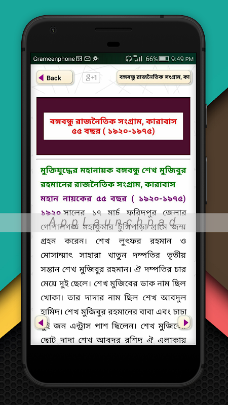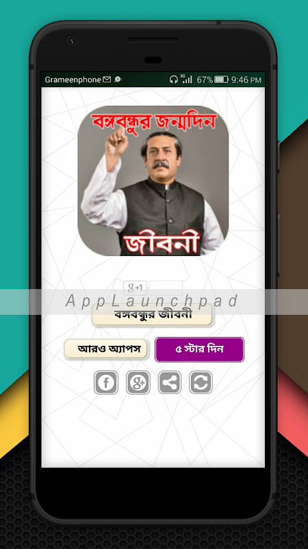 Die App wurde mit der gesamten Geschichte von der Geburt des Bangabandhu Sheikh Mujibur Rahman bis zum Tod dekoriert. Bangabandhu Sheikh Mujibur Rahman, der Vater des tausendjährigen Architekten Bangladeschs, wurde in der Gopalganj-Unterteilung der damaligen Gopalganj-Unterteilung des Großraums Faridpur geboren.