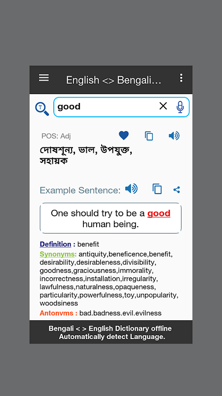 Bengali und Englisch Offline-Wörterbuch. Einfaches Suchsystem erkennt automatisch die Sprache Englisch und Bengali, wenn das Wort in das Suchfeld eingegeben wird.