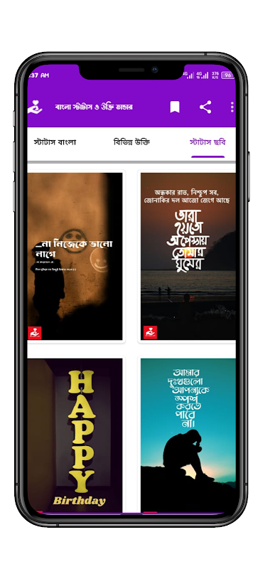 Hier ist die Bangla Status and Quotes Collection মোবাইল অ্যাপ্লিকেশন যা বিশেষভাবে ডিজাইন করা হয়েছে বাংলা ভাষাভাষী ব্যবহারকারীদের জন্য। এই অ্যাপটি নানা ধরণের স্ট্যাটাস এবং উক্তি Das ist nicht der Fall মিডিয়া প্ল্যাটফর্মে শেয়ার করতে বা তাদের অনুভূতি প্রকাশের জন্য ব্যবহার করতে পারেন।