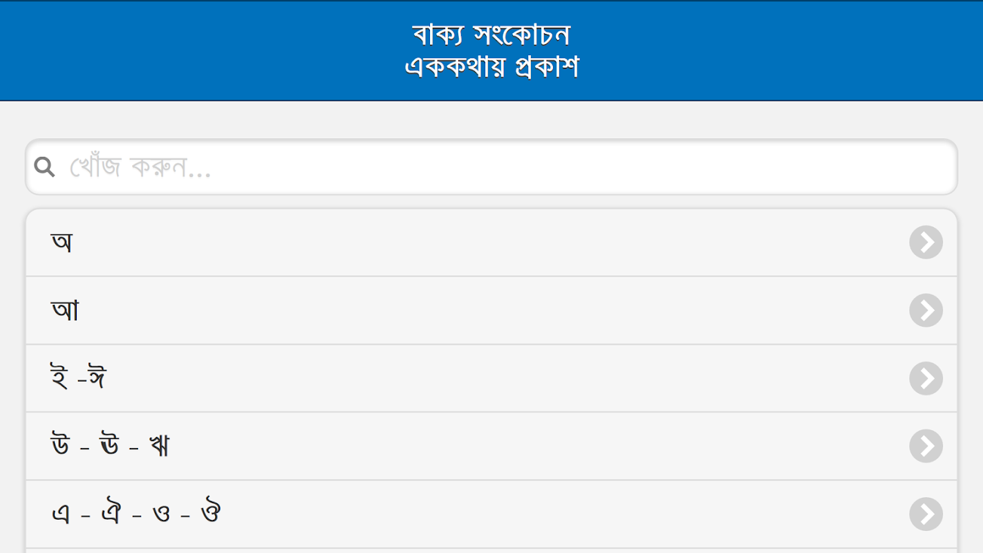 এপটিতে রয়েছে ৫০০ এর অধিক বাংলা বাক্য সংকোচন সংগ্রহ। রয়েছে একটি সার্চ অপশন যা দিয়ে বর্ণানুক্রমিক লিস্ট থেকে আপনার কাঙ্কিত তথ্য খুজে নিতে পারবেন।