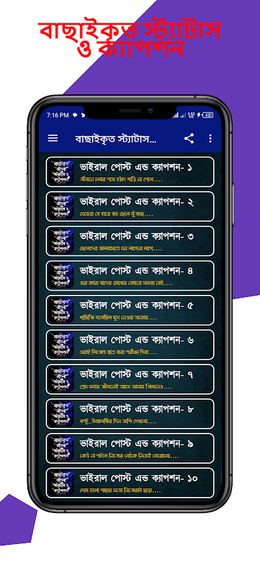 বাছাইকৃত বাংলা স্ট্যাটাস ও ক্যাপশন এপটি সকল ধ রনের স্টাটাস দেওয়া হয়েছে