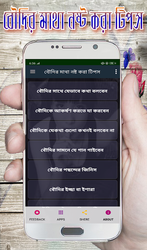 অনেক ছেলেই আছে যারা সপ্ন দেখে যে কিভাবে বৌদির মন জয় করা যায়। বৌদির সাথে প্রেম করা যায়। বৌদির মাথা নষ্ট করে বৌদির সাথে সময় কাটানো যায় ।বৌদির ইচ্ছা গুলো পুরণ করা যায়। তাদের জন্যই আমাদের এই এপসটি। এই এপসটিতে রয়েছে বৌদিদের নিয়ে কথা বা বৌদির সাথে কি ভাবে কি করবেন সকল উপায়। তাই এপসটি ভালো করে পড়ুন।