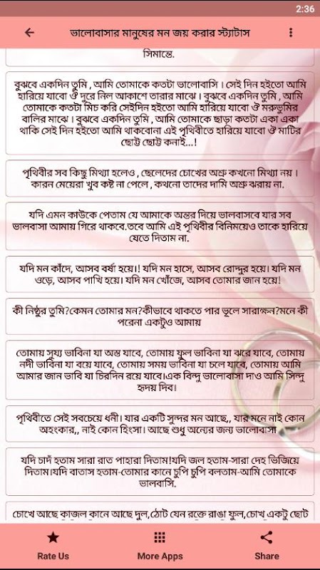 আমাদের অ্যাপের মধ্যে আপনি "ভালোবাসার মানুষের মন জয় করার Status" সকল স্ট্যাটাস খুব সহজেই পেয়ে যাবেন। প্রতিটি স্ট্যাটাস "COPY" করে খুব সহজেই আপনি আপনার প্রেমিক বা প্রেমিকাকে পাঠাতে পারবেন। শুধু আপনাদের সুবিদার্থে আমার অক্লান্ত পরিশ্রমের ফলশ্রুতিতে এই অ্যাপটি বানানো।