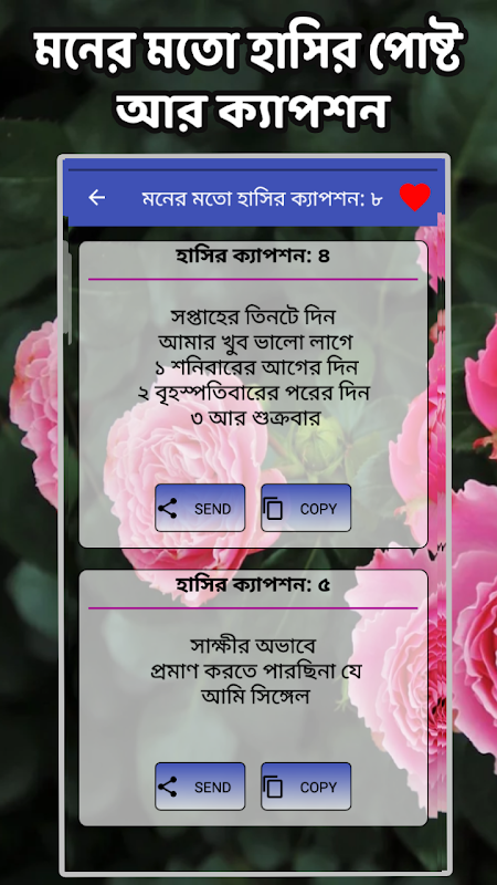 এই অ্যাপসটিতে যে সব হাসির পোষ্ট আর ক্যাপশন আছে তা অপনি বন্দুদের সাথে ১ কিল্কে কপি এবং শেয়ার করতে পারবেন ।প্রতিটি পোস্ট আর ক্যাপশন বাছাইকৃত ভাবে নেওয়া হয়েছে । আশা করি অ্যাপসটি আপনাদের অনেক ভালো লাগবে।