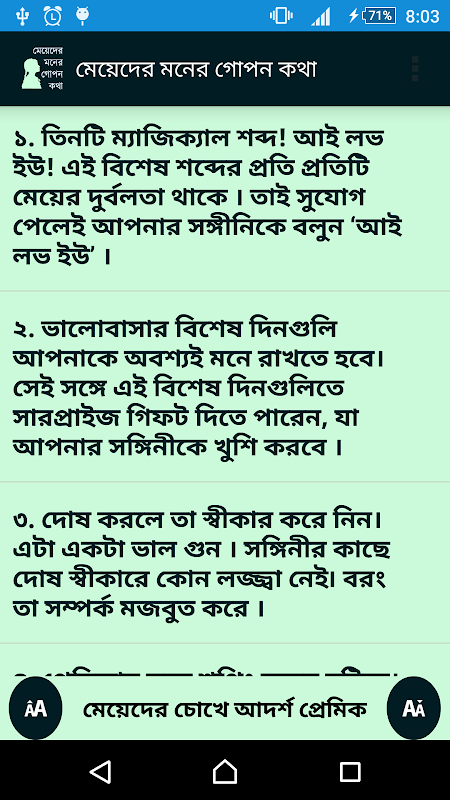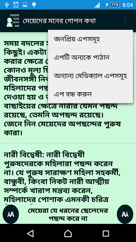 হয়তো বা। কিন্তু সে চিন্তায় আর না গিয়ে আপাতত আমরা নিয়ে এলাম সহজ সমাধান! মেয়েদের মনের গোপন কথা। কিছু সুচিন্তিত ও নির্বাচিত আর্টিকেল নিয়ে সাজানো এই এপলিকেশনটি। ছেলেদের জন্য মেয়েদের মনের কিছু অংশ অন্তত বুঝতে দারুণ কাজে লাগবে বলে আমাদের বিশ্বাস।