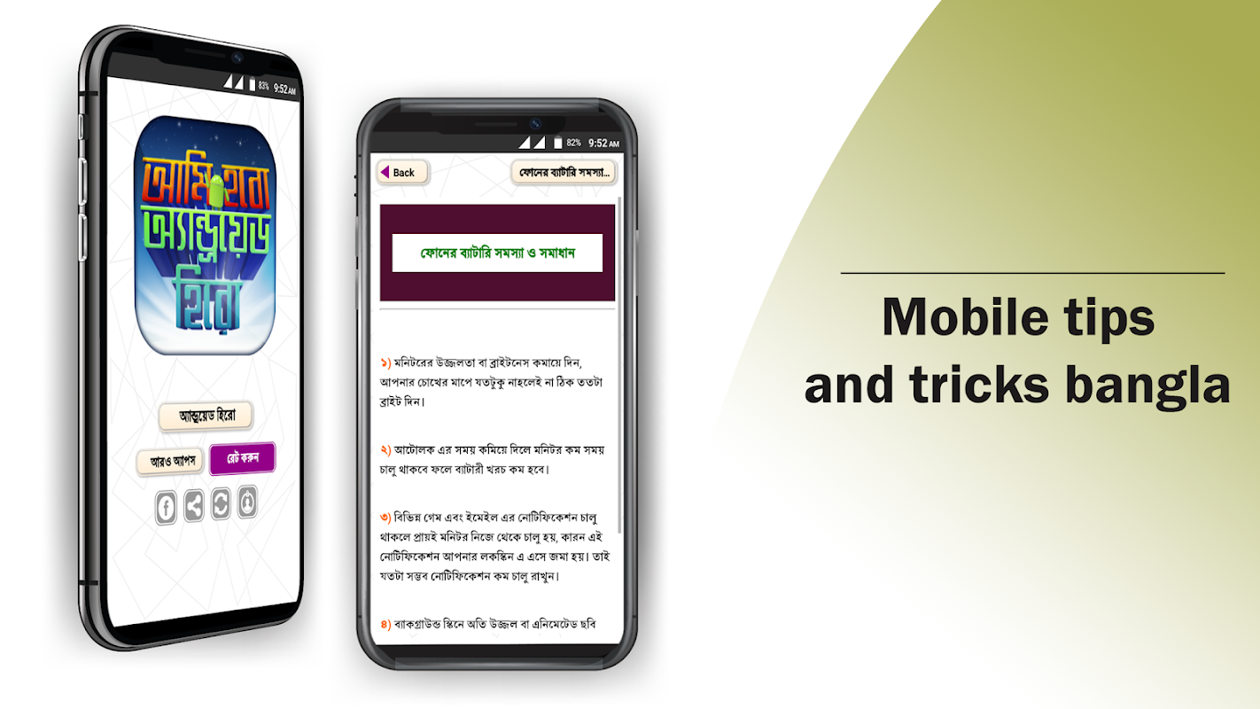 এই অ্যাপটির মাধ্যমে আপনি জানতে পারবেন এন্ড্রয়েড মোবাইল খুটিনাটি বা স্মার্টফোনের স্মার্টফোনের। মোবাইলের খুটিনাটি বিষয় নিয়ে মাঝেমধ্যে বিপাকে পরতে হয় তাই আমরা নিয়ে এসেছি বাংলা মোবাইল টিপস বা মোবাইল টিপস বাংলা সমাধান। আর সেই সাথে হয়ে উঠবেন এন্ড্রয়েড গুরু বা মোবাইল বিশেষজ্ঞ।