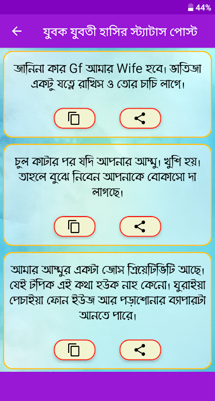 আমাদের এই অ্যাপটির মাধ্যমে তোমরা তোমাদের বন্ধু বান্ধবীদের অস্থির হাসির ও সেইরকম ধরনের নিত্য নতুন স্ট্যাটাস ও পোষ্ট শেয়ার করে মনকে রাখতে পারবেন ও আনন্দময় আনন্দময়।